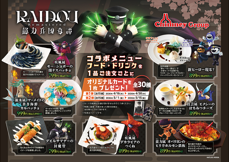 ※コラボ開始数日間は混雑が予想されます。コラボメニュー・ノベルティのご提供数にも限りがあるため、お電話またはWebからのご来店予定店舗のご予約をお勧めしております。ご予約の際、「ライドウコラボ利用」の旨を添えていただけると比較的スムーズにご案内が可能です。