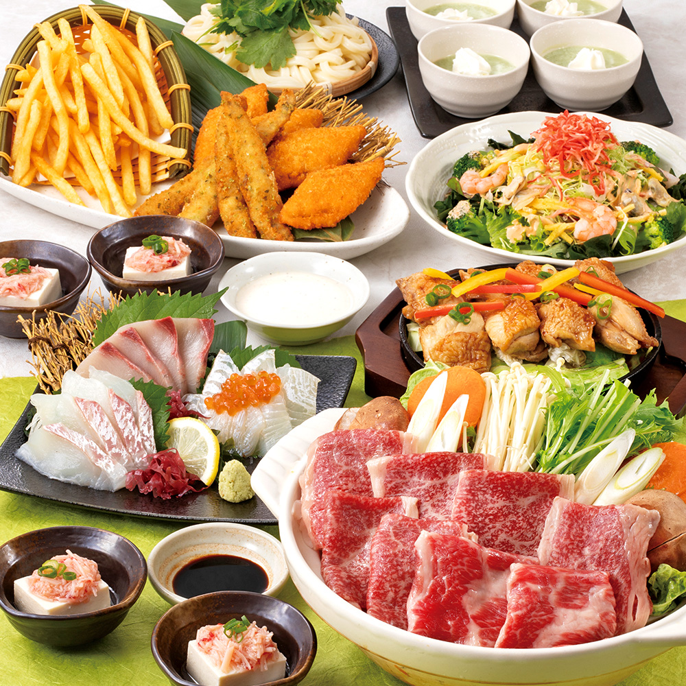黒毛和牛こうねすき鍋や刺身三種盛合せ等
