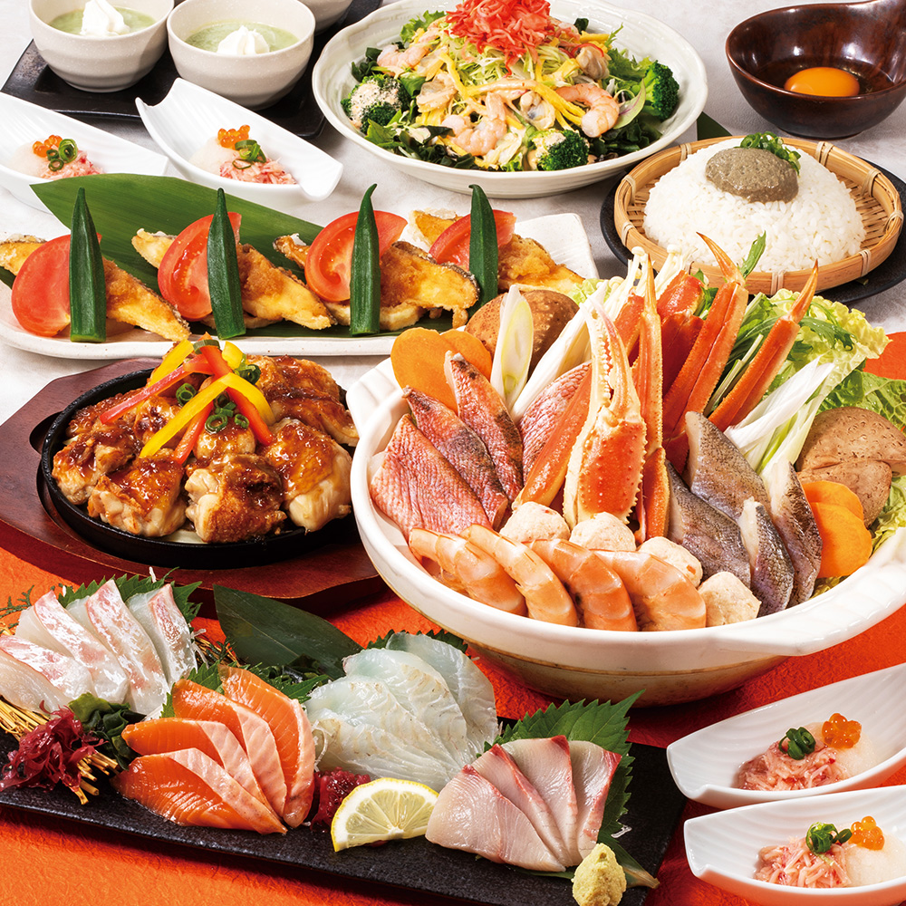 本ズワイガニ入り海鮮鍋や炭焼き風鶏鉄板焼き等
