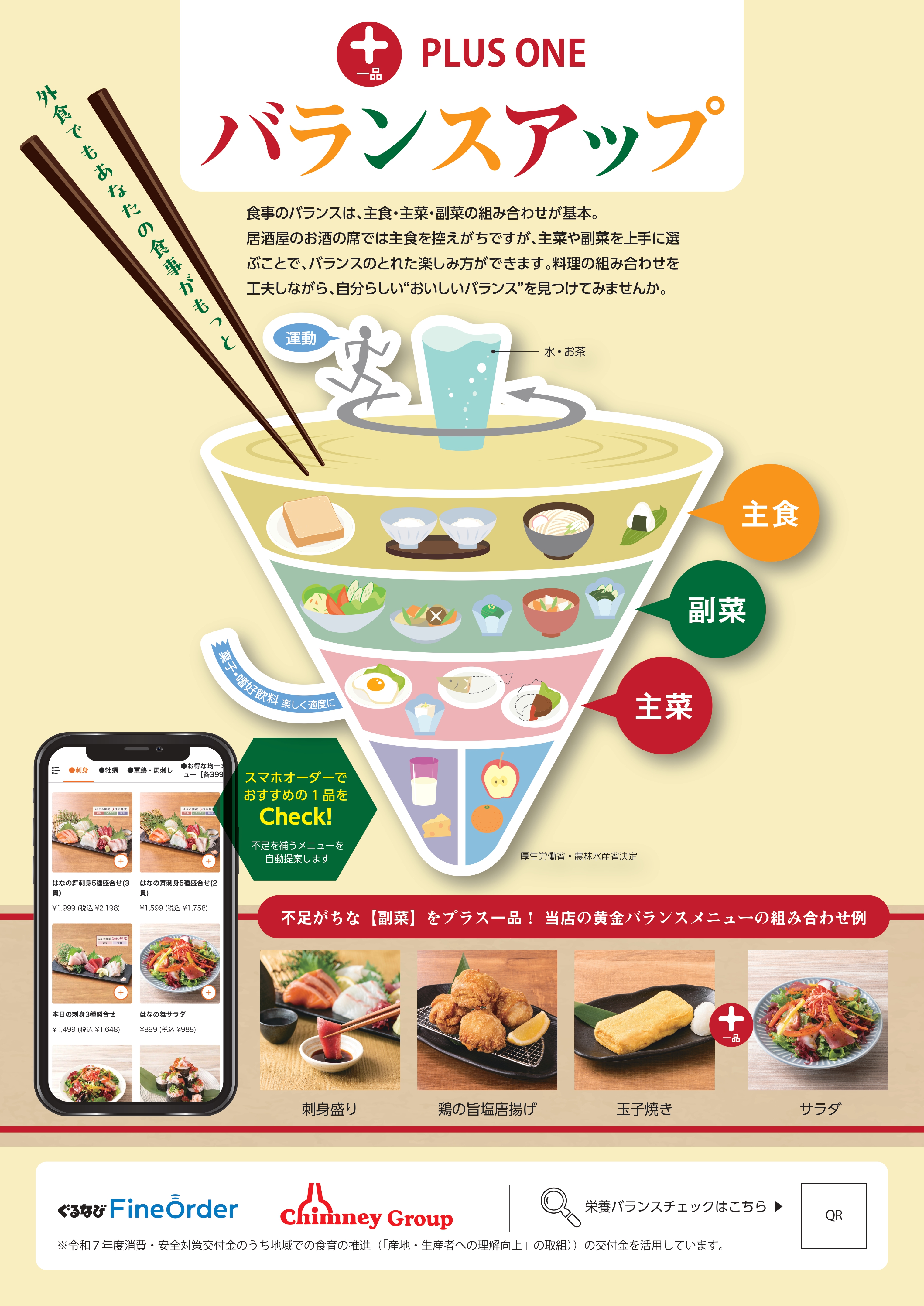 農林水産省の「令和7年度消費・安全対策交付金(地域での食育の推進)」事業の一環として、チムニーの店舗では現在ぐるなび社の提供するモバイルオーダーシステムを活用し、外食時の消費者の栄養バランス改善を促す実証実験を行っています。