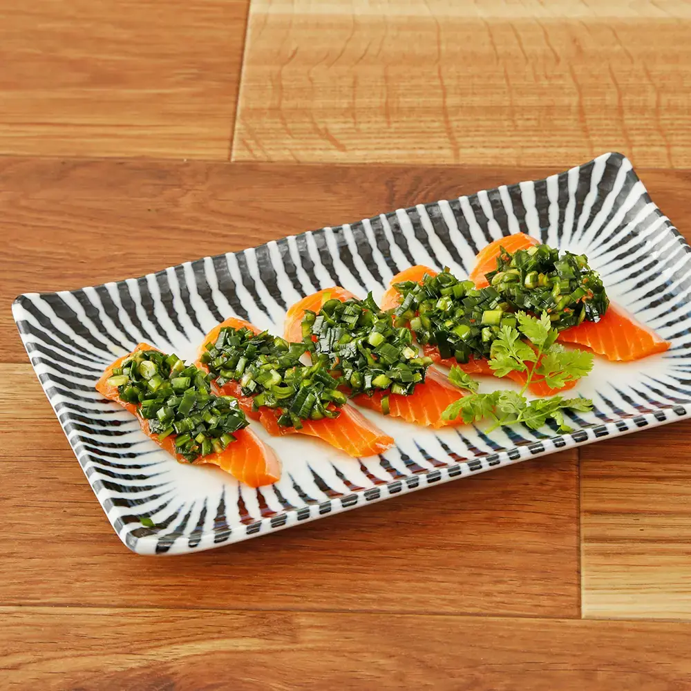 ピリッと辛味の効いたニラだれと脂ののったサーモンの組み合わせはお酒がすすむおいしさです。