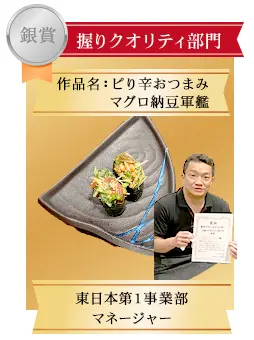 まずは関東圏の「我こそは!」という社員を集め、試験の基準を決めると共に「寿司グランドマイスターコンテスト」を開催し、上記の9名の方々が受賞されました。 参加者全員鮮魚を捌き、切り付け、寿司の盛り付けを行い、店頭と本社販売をし90食完売、お客様より「大変美味しかったよ!」という声を頂きました。 今後もこのような取り組みを全国へ展開していきます!